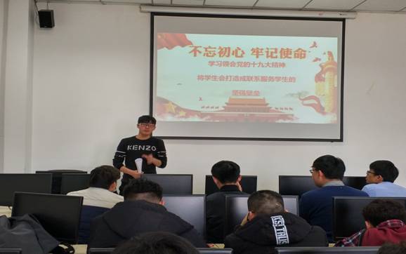 会议伊始,孙韶聪同学首先带领同学们回顾了党的十九大会议议程以及政府工作报告。“习总书记的工作报告自始至终坚定自信、气势磅礴,作为新时代的青年人应该在这种新时代下绽放青春激情,以新作为书写人生华章。”随后,孙韶聪同学结合我院实际情况就目前学生会状况进行发言,“习总书记的十九大工作报告中说道青年兴则国家兴,青年强则国家强。中华民族伟大复兴的中国梦终将在一代代青年的接力奋斗中变为现实。青年所担负的责任是重大的,而我们作为国际教育学院团委学生会的一员,全体成员应该面对困境迎难而上,用最高效最实际的方法全心全意为同学们服务,真正起到老师和学生之间的桥梁纽带作用。”随后,学生会副主席高伟超同学发言,他全面总结了本次会议精神,并鼓励我们青年团员,要发挥“党有号召,团有行动”的精神,继续在学生会工作的岗位上贡献自己的青春智慧和力量。