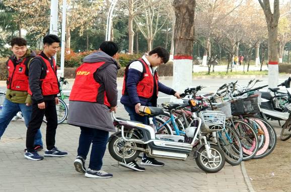 践行十九大精神,从身边小事做起。为创建优美、整洁、有序的校园环境,2017年12月22日下午四点,国际教育学院团委学生会组织学生会党员骨干于我院学生住宿公寓区嘉园1、2号楼周围开展“单车齐摆放,志愿我先行”志愿服务活动。