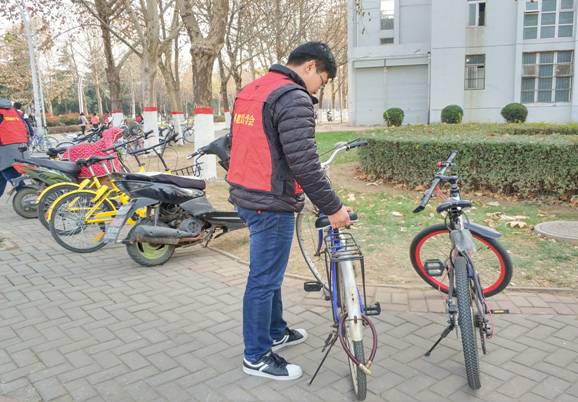 践行十九大精神,从身边小事做起。为创建优美、整洁、有序的校园环境,2017年12月22日下午四点,国际教育学院团委学生会组织学生会党员骨干于我院学生住宿公寓区嘉园1、2号楼周围开展“单车齐摆放,志愿我先行”志愿服务活动。